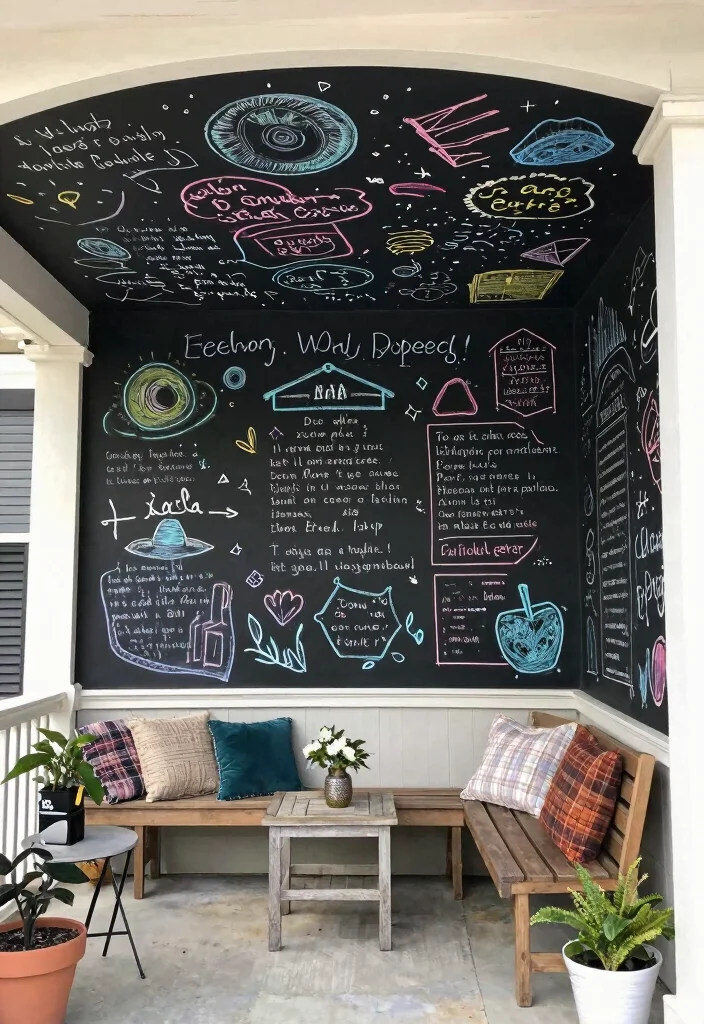 For a fun and interactive twist, consider a chalkboard-painted ceiling for your porch. This design invites creativity, allowing you and your guests to express themselves through drawings or messages, making every gathering memorable. A chalkboard ceiling is perfect for casual outdoor settings, adding an element of playfulness and whimsy to the space.
