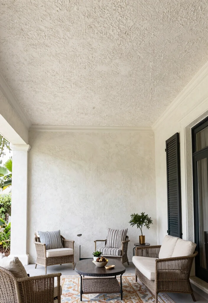 For a sophisticated and textured appearance, consider a plaster ceiling with a unique finish. This style brings an elegant touch that makes your porch feel like an extension of your home’s interior. Plaster can be shaped and finished in various ways, allowing for custom designs that add depth and visual interest to the ceiling.