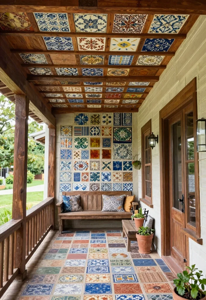 To implement this design, consider mixing and matching different tile patterns for a unique look. Opting for a neutral color palette can keep the focus on the intricate tile designs. Pairing these tiles with vintage furniture will complete the nostalgic atmosphere, making your porch a charming retreat.