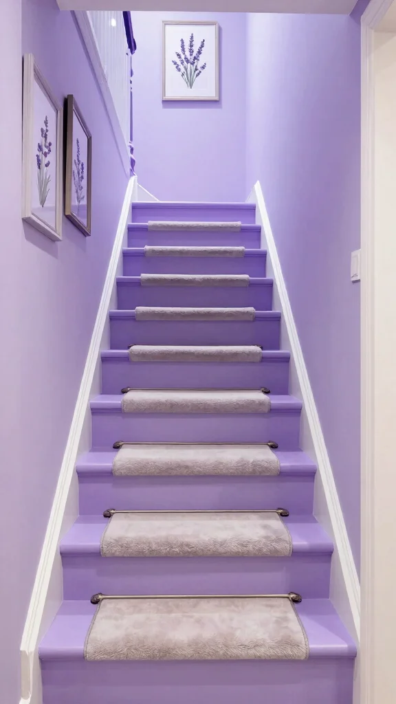 – Fabric Accents: Consider a soft, plush runner in lavender or a similar shade to add comfort to the stairs.