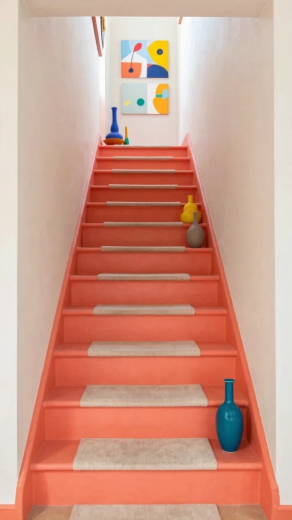 Warm coral captures the essence of summer, infusing brightness and cheerfulness into your staircase. This lively color can instantly uplift the mood of your home, pairing beautifully with other pastels or earthy tones. Coral staircases serve as eye-catching focal points, drawing attention and adding a playful pop to any entryway.