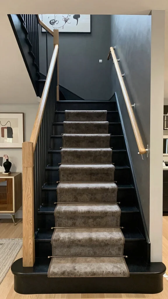 – Pros: Adds depth and drama to staircases, hides wear and tear, and can create a striking contrast against lighter walls.