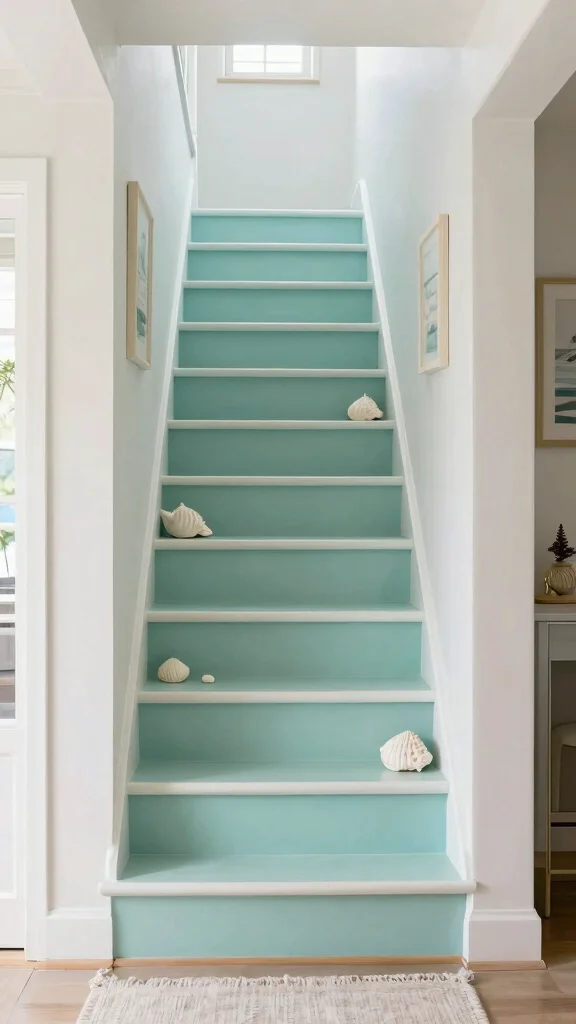 Light teal is an excellent choice for creating a fresh, coastal vibe in your home. This soothing color evokes calmness and serenity, making it perfect for a staircase that welcomes guests with a tranquil atmosphere. Teal pairs wonderfully with white or sandy accents, enhancing the beachy feel and creating an inviting entryway.