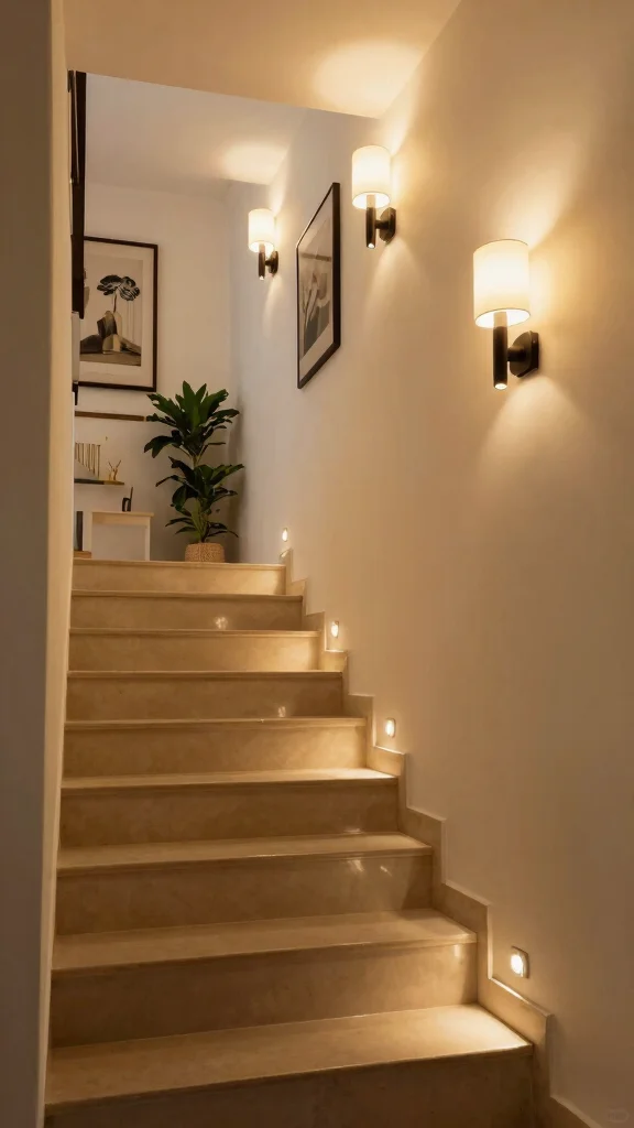 Lighting is your friend—think LED strip lighting along treads or wall sconces to brighten the space. A light-colored runner or painted risers expands the feel of the stairs. Add a slim wall gallery or vertical plant group to bring personality without bulk. Use under-stair storage or a tiny console at the base to boost function. Keep surfaces clean and limit decor to three well-chosen pieces for a calm, finished look.