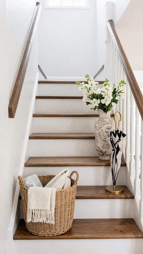 Small decorative accessories can make a significant impact on your staircase decor. Consider incorporating stylish items like umbrellas, baskets, or decorative vases at the base or along the steps to add charm and functionality. These accents not only provide personality but can be easily rotated seasonally to refresh the look.