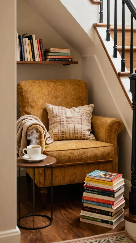 Transform any landing or alcove in your staircase into a cozy reading nook. A small chair or inviting bench adorned with plush throw pillows can create an ideal spot to relax with a good book. Add a side table to hold your coffee or a stack of your favorite reads, making it a stylish yet functional retreat.