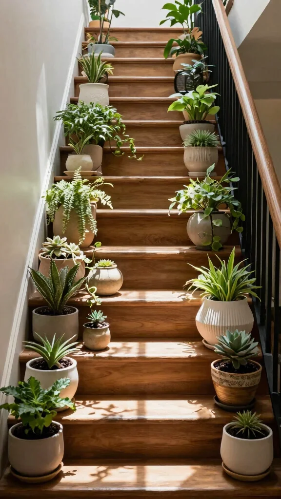 This natural element not only purifies the air but also enhances the aesthetic appeal of your staircase. Mixing various plant sizes and types adds visual interest and provides a fresh, lively environment.