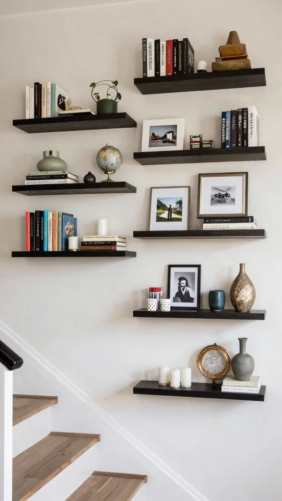This solution maximizes vertical space, especially in smaller areas, while offering a stylish way to display personal treasures. It also allows for seasonal decor changes, keeping your staircase looking fresh and organized.