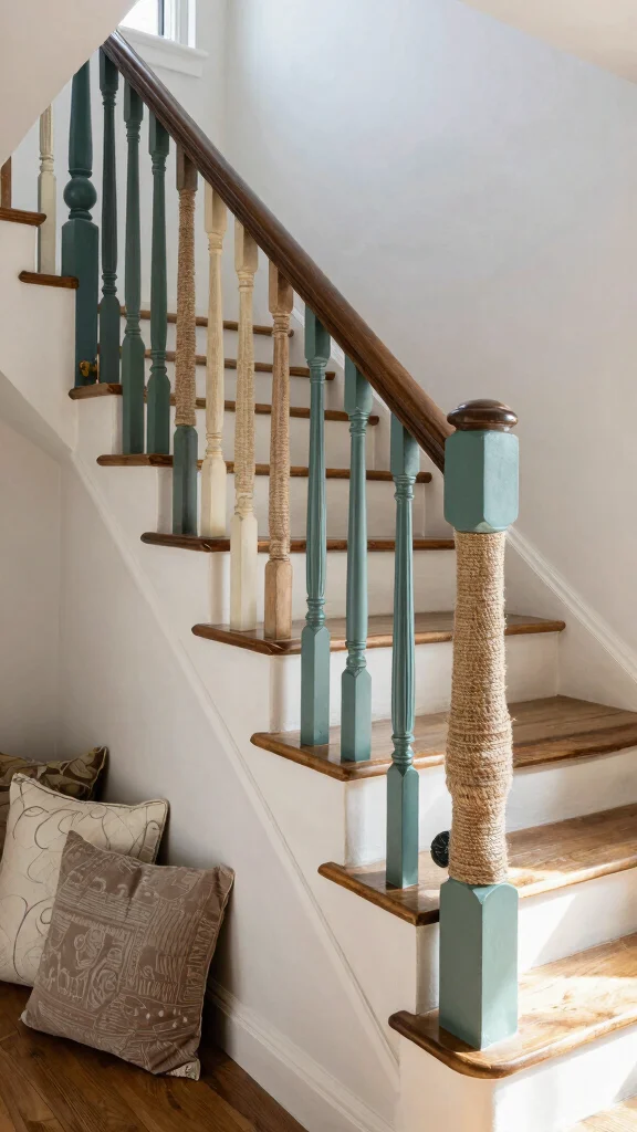 Elevate the visual charm of your staircase by upgrading your handrails with decorative touches. You can paint them in bold colors, wrap them in jute for a rustic appeal, or add decorative brackets that align with your home’s style.
