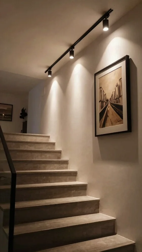 Track lighting provides a versatile solution for illuminating your staircase, offering adjustable lighting that can be directed where needed most. This feature is especially useful in multi-level homes, allowing you to spotlight artwork or architectural features along the staircase. The flexibility of track lighting means you can easily change the focus as your decor evolves.