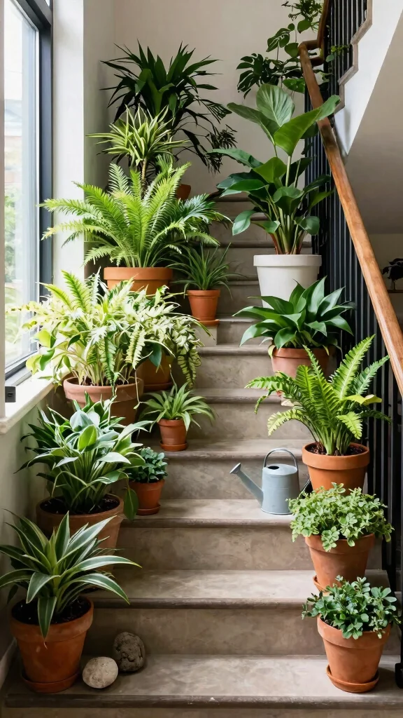 To succeed with this idea, select plants that thrive in varying light conditions according to your staircase’s exposure. Use eco-friendly pots made from recycled materials to align with your sustainability efforts.
