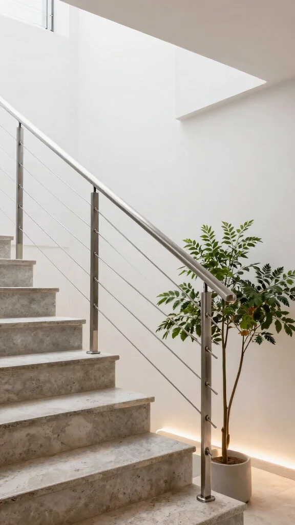 For a clean, minimalist look, wire railings provide an ideal solution without compromising safety. Made from stainless steel cables, these railings offer a sleek barrier that maintains the focus on your staircase. They excel in modern homes, allowing for an unobstructed view while enhancing the overall design.
