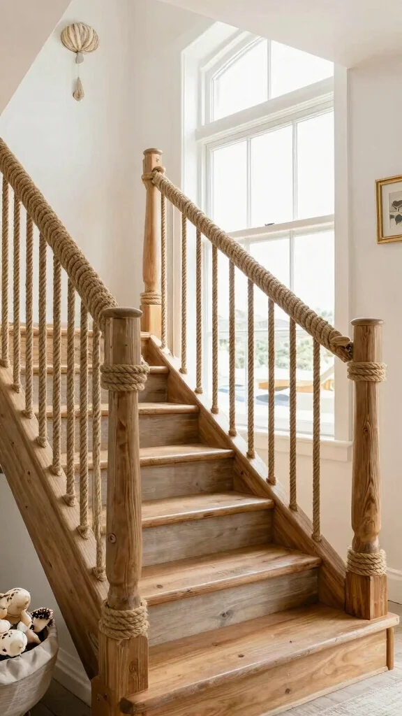 Add a coastal or nautical touch to your staircase with creative rope railings. Thick, sturdy rope creates a cozy atmosphere, perfect for beach-themed homes or cottages. Pairing it with wooden posts not only ensures stability but also brings warmth and texture that traditional materials lack.