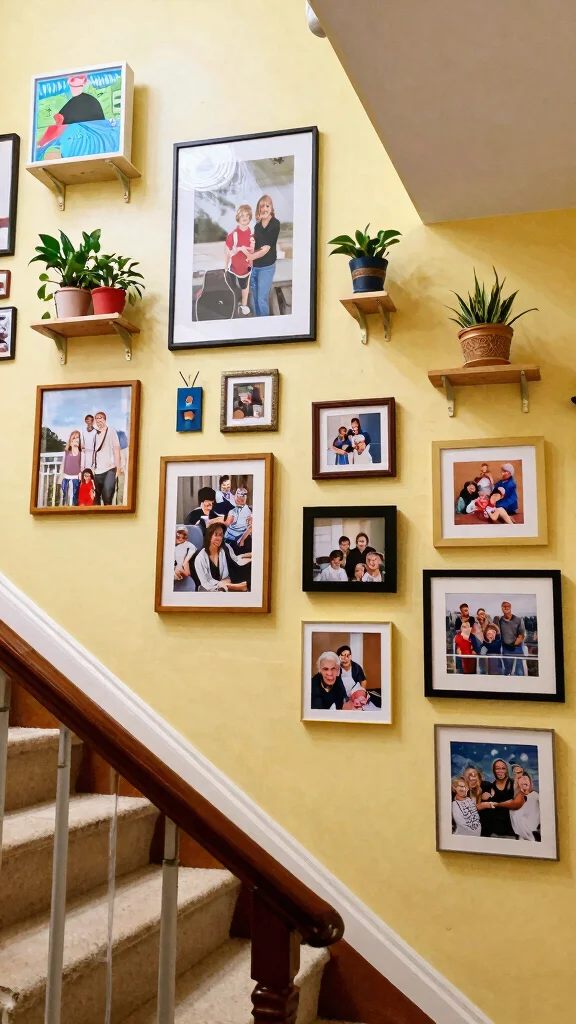 Transform the wall alongside your staircase into a captivating gallery wall that doubles as a storage solution. This setup can feature a mix of framed photos, artwork, and decorative shelves, creating a visually appealing area that can be updated over time. By blending art with smart storage options, you keep your space dynamic and engaging.