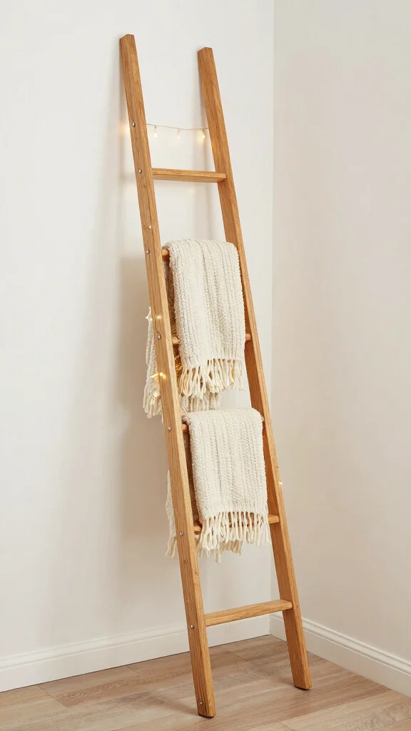 A decorative ladder can serve as a chic, space-saving storage option for your staircase. Leaning it against the wall allows you to hang items like throws or magazines, adding a whimsical touch while keeping essentials accessible. This method not only saves space but also introduces visual height and interest to your decor.