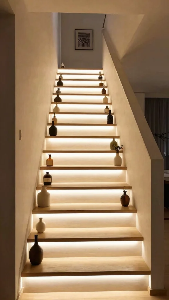 Choose built-in shelves that don’t crowd the steps and rely on functional decor like a single vase to maintain visual clarity. Selecting muted colors that blend seamlessly with the surroundings can enhance the minimalist aesthetic.