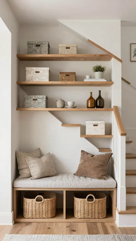 Fun fact: open staircase shelves can boost display space by up to 30% without bulk. Mix heights and widths for drama, and let stairs storage ideas blend practicality with style in every step.