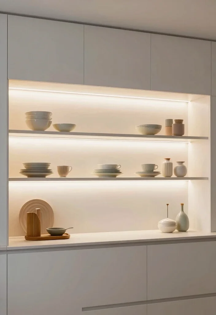 Open shelving is a trendy option in kitchen design, and adding under cabinet lighting can beautifully highlight your decorative items. Using LED strips or small puck lights creates an airy feel while showcasing your favorite dishware or cookbooks.