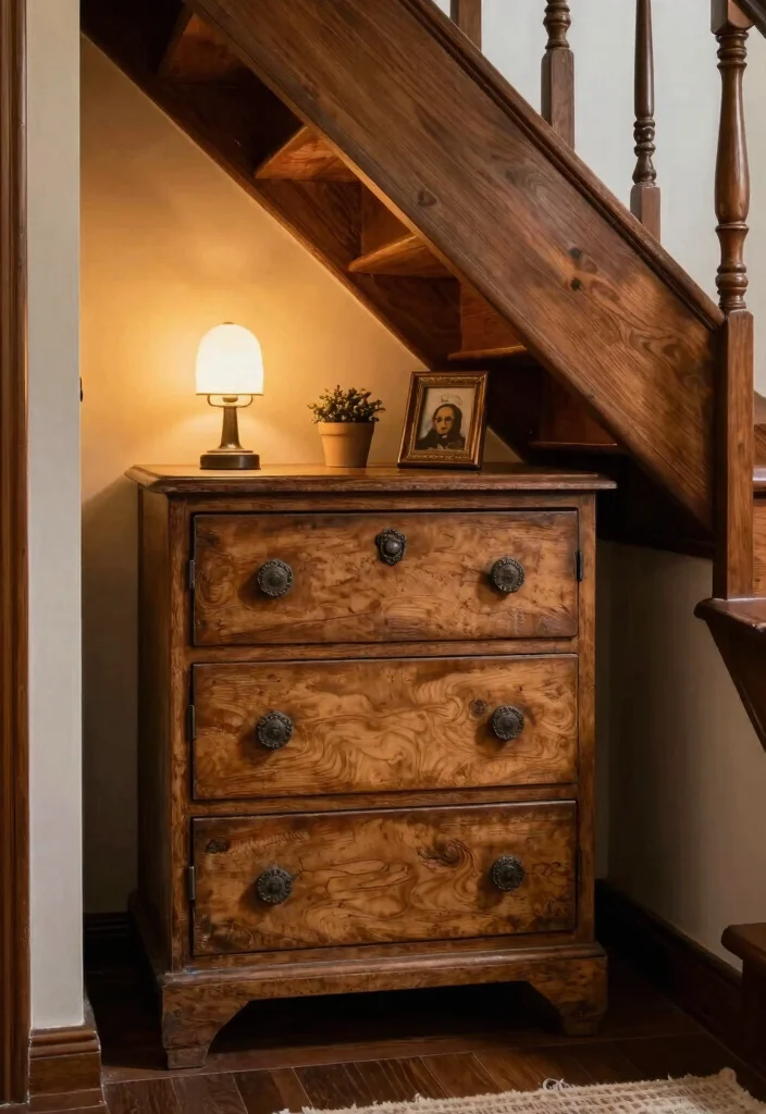Add a touch of charm to your under stairs space with a vintage chest of drawers, creating a storage solution that tells a story. This timeless design not only provides multiple compartments but also serves as a captivating focal point in your home. Imagine a beautifully crafted chest, perhaps featuring distressed finishes or vintage woods, infusing warmth and character into your living area.