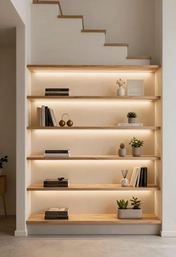 Open shelving offers an excellent way to keep your frequently used items accessible while enhancing the visual appeal of your under stairs storage. Choose floating shelves to create a spacious, airy feel, showcasing items like books, plants, or decorative boxes. Imagine accent lighting illuminating these shelves at night, bringing both storage and decor to life in a warm glow.