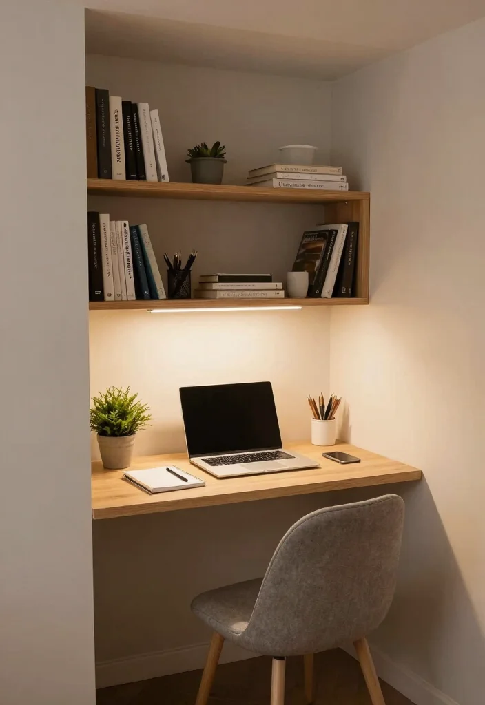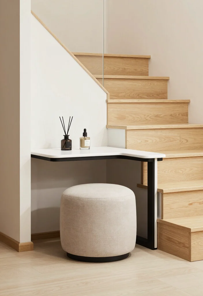 Add a small, comfortable chair that fits snugly under the desk to complete the setup. This design maximizes your space while promoting productivity in a stylish way.