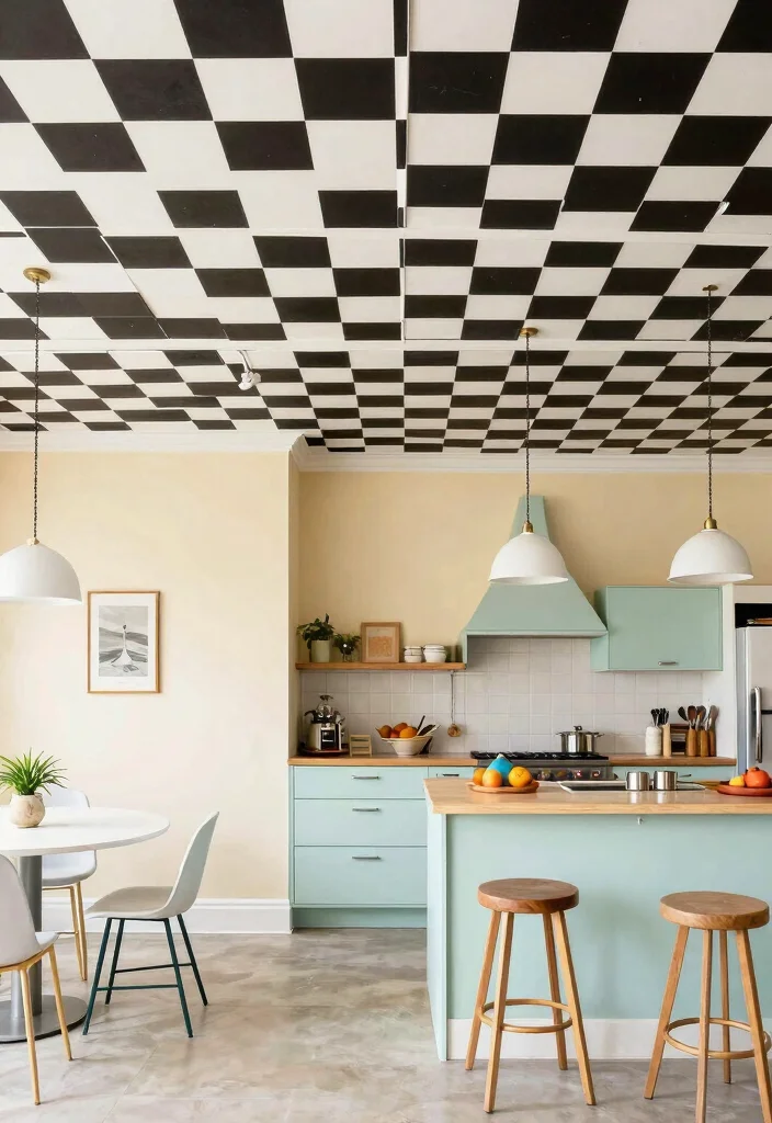 Classic checkerboard patterns provide a playful yet timeless appeal to your ceiling. Vintage checkerboard wallpaper can bring a retro vibe to kitchens or casual dining spaces, inviting a lively atmosphere. Opt for contrasting colors like black and white or softer tones for a more subtle effect.