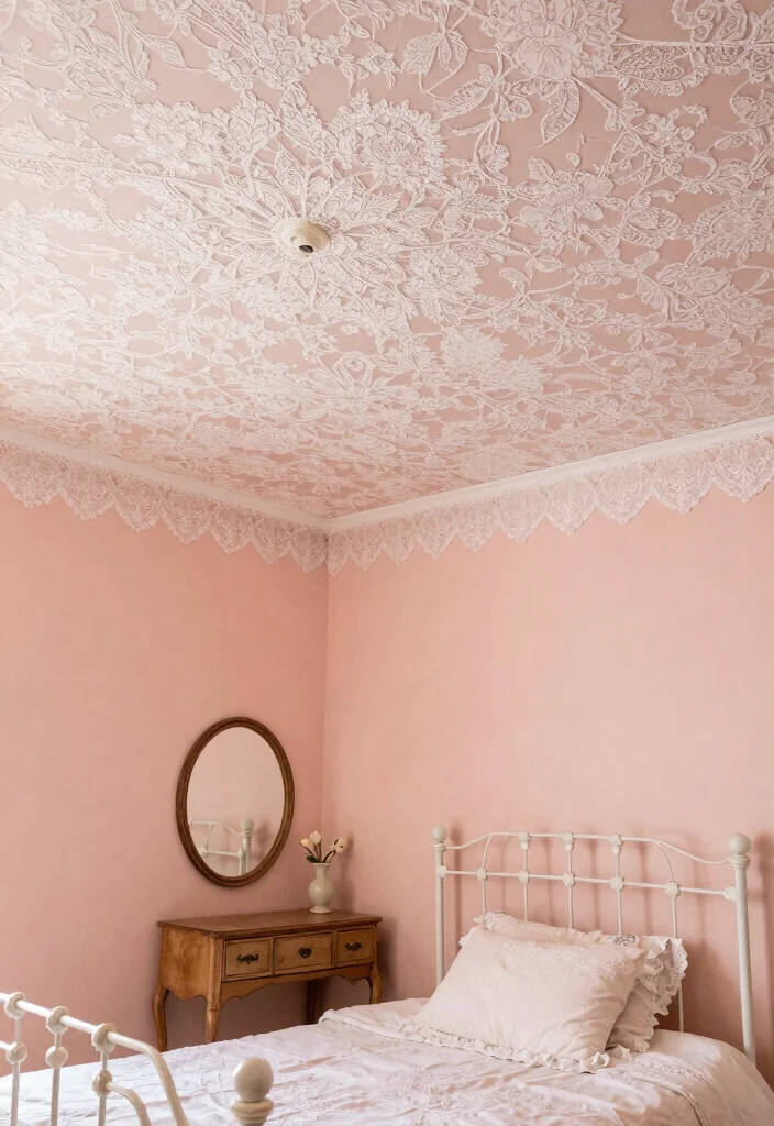 Adding a delicate touch to your ceiling with lace wallpaper creates a vintage charm that feels both elegant and inviting. Soft colors and intricate lace designs evoke romance, making this style ideal for bedrooms or intimate dining areas.