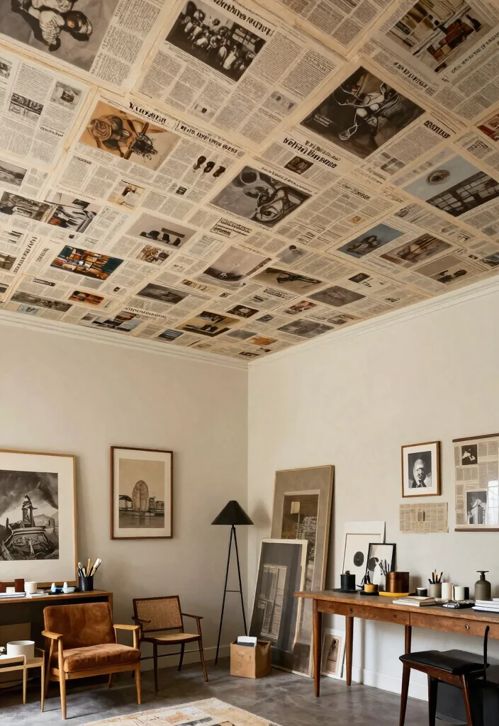 For a one-of-a-kind aesthetic, consider a vintage newspaper collage on your ceiling. This creative approach adds an eclectic feel, ideal for studios or informal dining areas. Layering various newspaper designs creates a textured effect that tells a unique story.