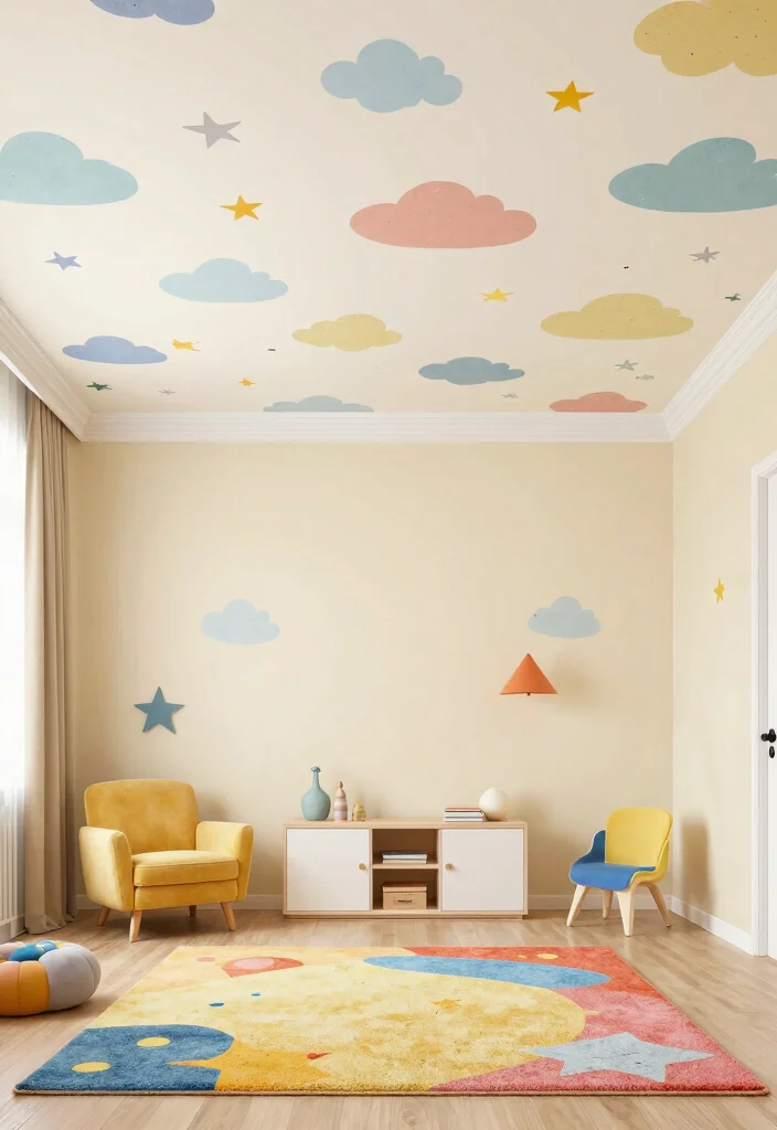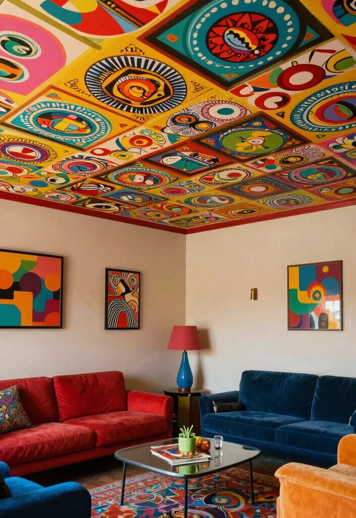 To style this look, select bright colors and nostalgic designs that reflect your personality. Complementing the ceiling with contemporary furniture creates balance, while decorative elements should reflect the pop art theme, such as quirky light fixtures. Keeping walls neutral allows the ceiling to take center stage.