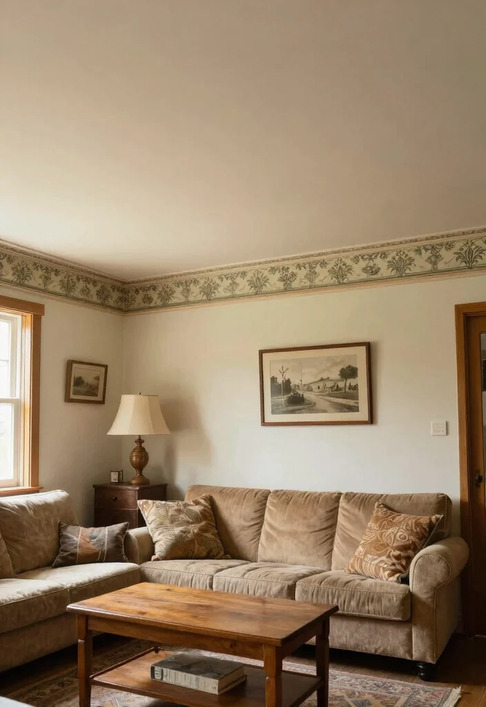 To style with wallpaper borders, choose a design that complements your main ceiling wallpaper or color. Light wall colors enhance the border’s visibility, while layering with crown molding adds an upscale touch. Balancing with classic decor elements like wooden furniture enhances the overall charm.