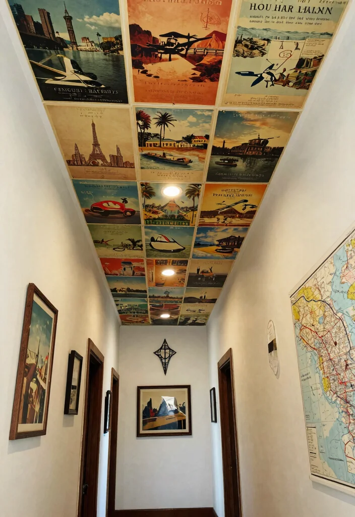 Finally, a ceiling adorned with vintage travel posters can evoke feelings of wanderlust and nostalgia. This approach works wonderfully in hallways, home offices, or guest rooms, creating a lively history that invites exploration.