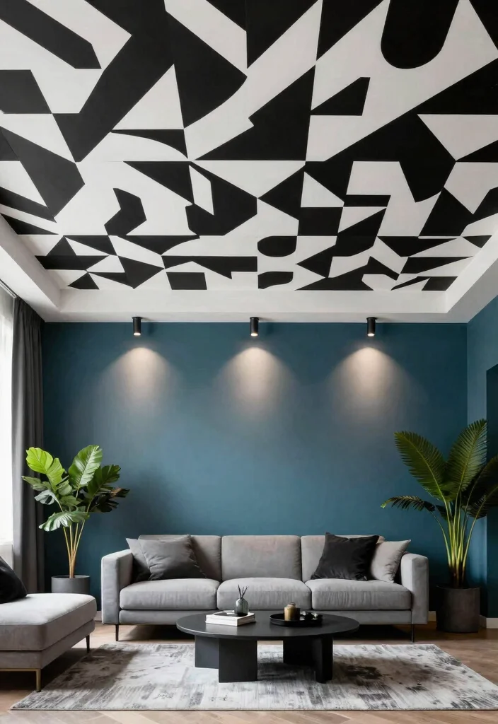 To create a stunning geometric ceiling, choose a pattern that harmonizes with your room’s decor. Use contrasting colors to make the ceiling a striking feature while balancing it with minimalistic furniture. Adding spotlights can enhance the geometric shapes, making them stand out even more.
