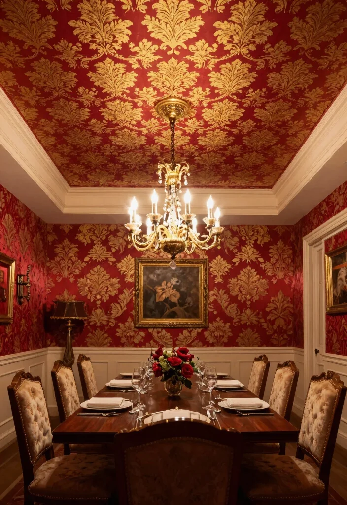 Opting for damask wallpaper on your ceiling introduces an element of elegance and tradition to your space. These vintage patterns create a luxurious backdrop, perfect for formal areas like dining rooms or parlors, evoking history and grandeur.