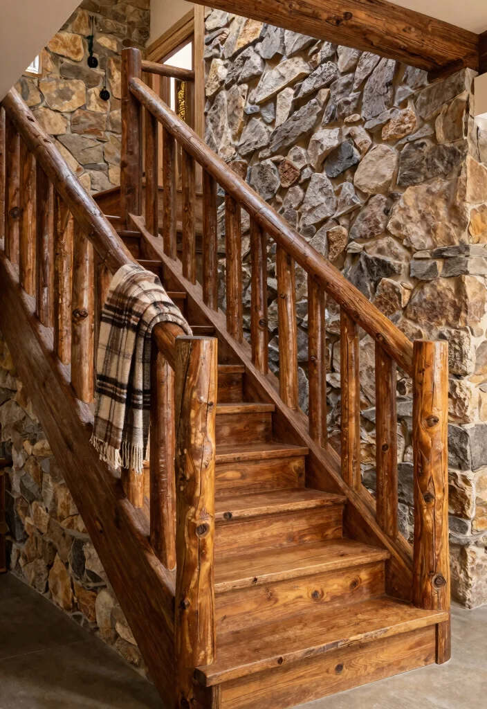 For a truly rustic aesthetic, log railings bring the charm of nature right into your home. Crafted from natural logs, these railings highlight the unique textures and knots in each piece, evoking a cozy cabin feel perfect for a retreat. Picture log railings alongside stone accents and earthy colors, creating a warm and inviting environment.